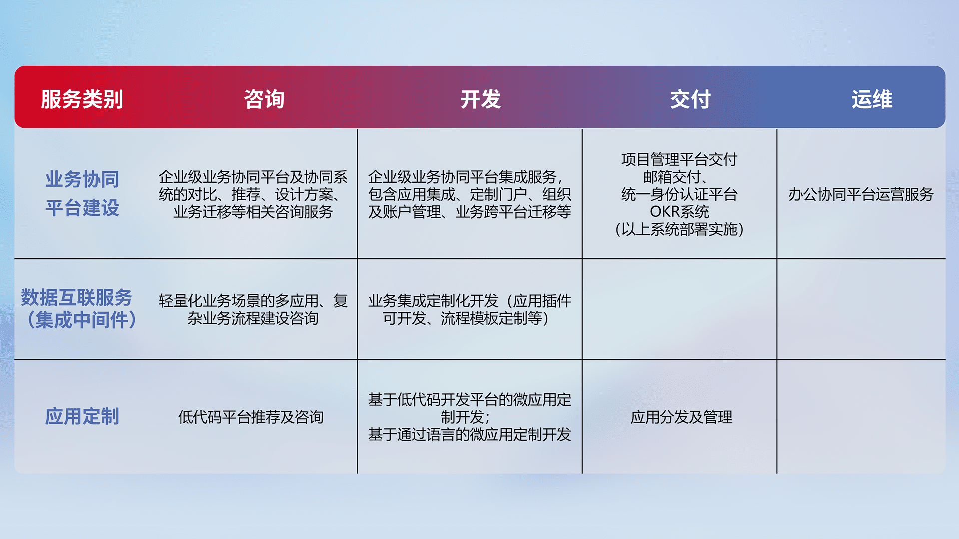 针对钉钉、、、、企微、、、IDaas等平台级产品提供产品的规划、、、方案、、交付、、、定制化开发等服务,,,实现如统一协同办公、、、、智能客户服务、、、、混合会议管理、、、智能数据查询、、、等业务场景,,,,实现数字化转型。。。。